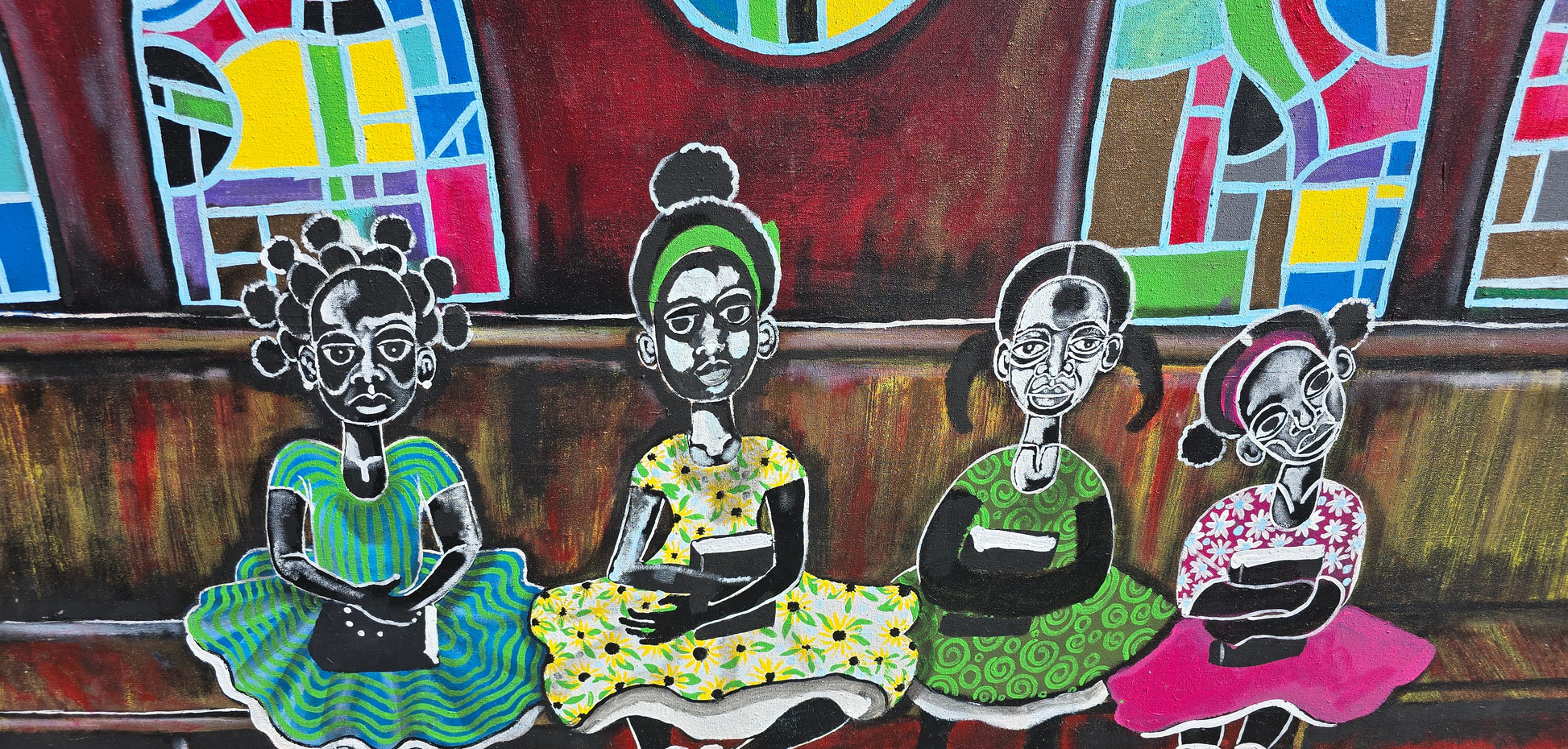 Seated beneath radiant stained-glass windows, the girls are rendered not in grief, but in light — dresses bright, posture calm, presence eternal. The stained glass glows in their honor, each pane a reminder of innocence, faith, and the cost of hatred.
