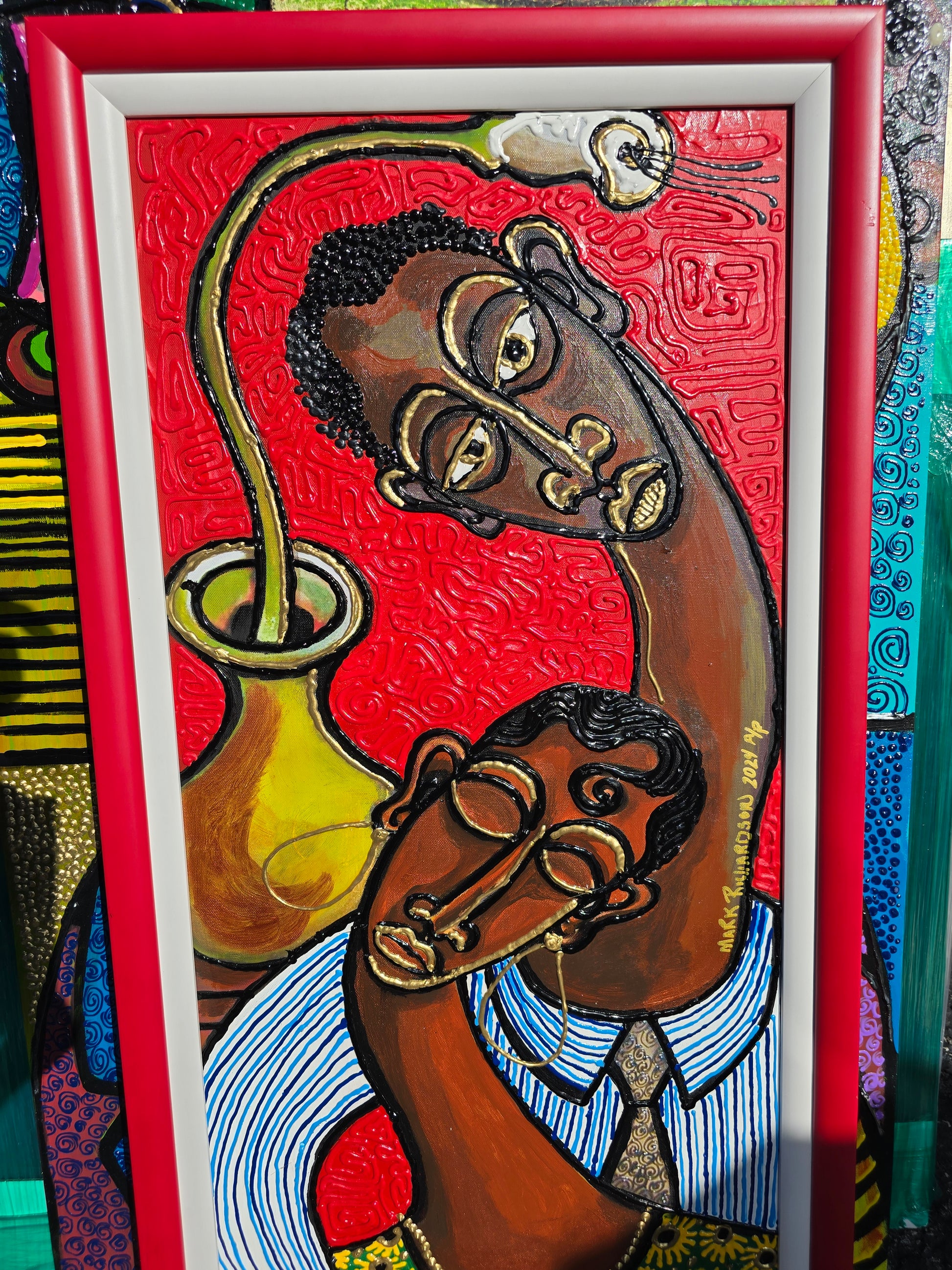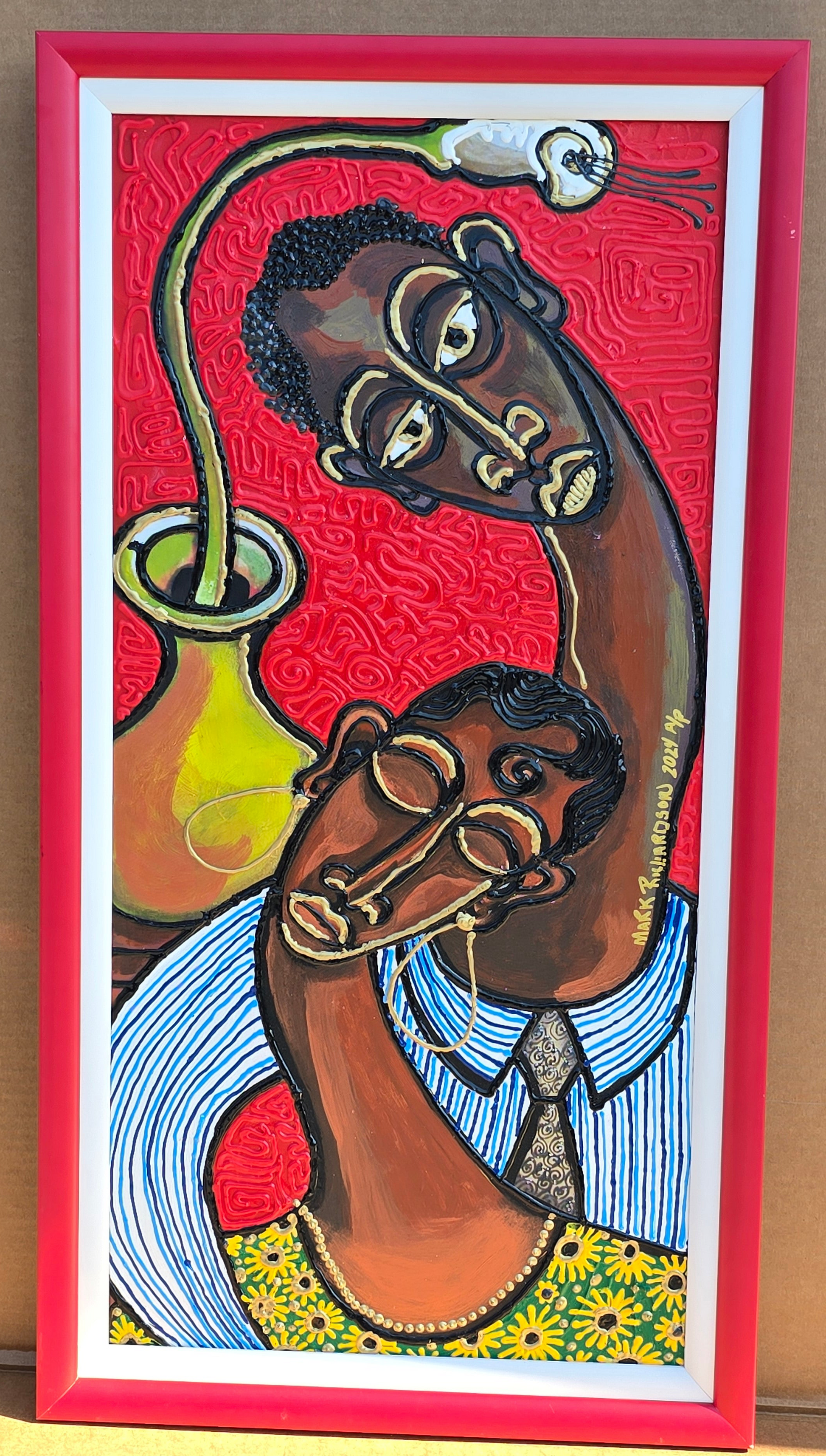Love Embrace (Series) captures a couple joined in unity, comfort, and emotional connection. Bold red texture and gold accents highlight the bond between them, making this piece both visually striking and deeply warm.