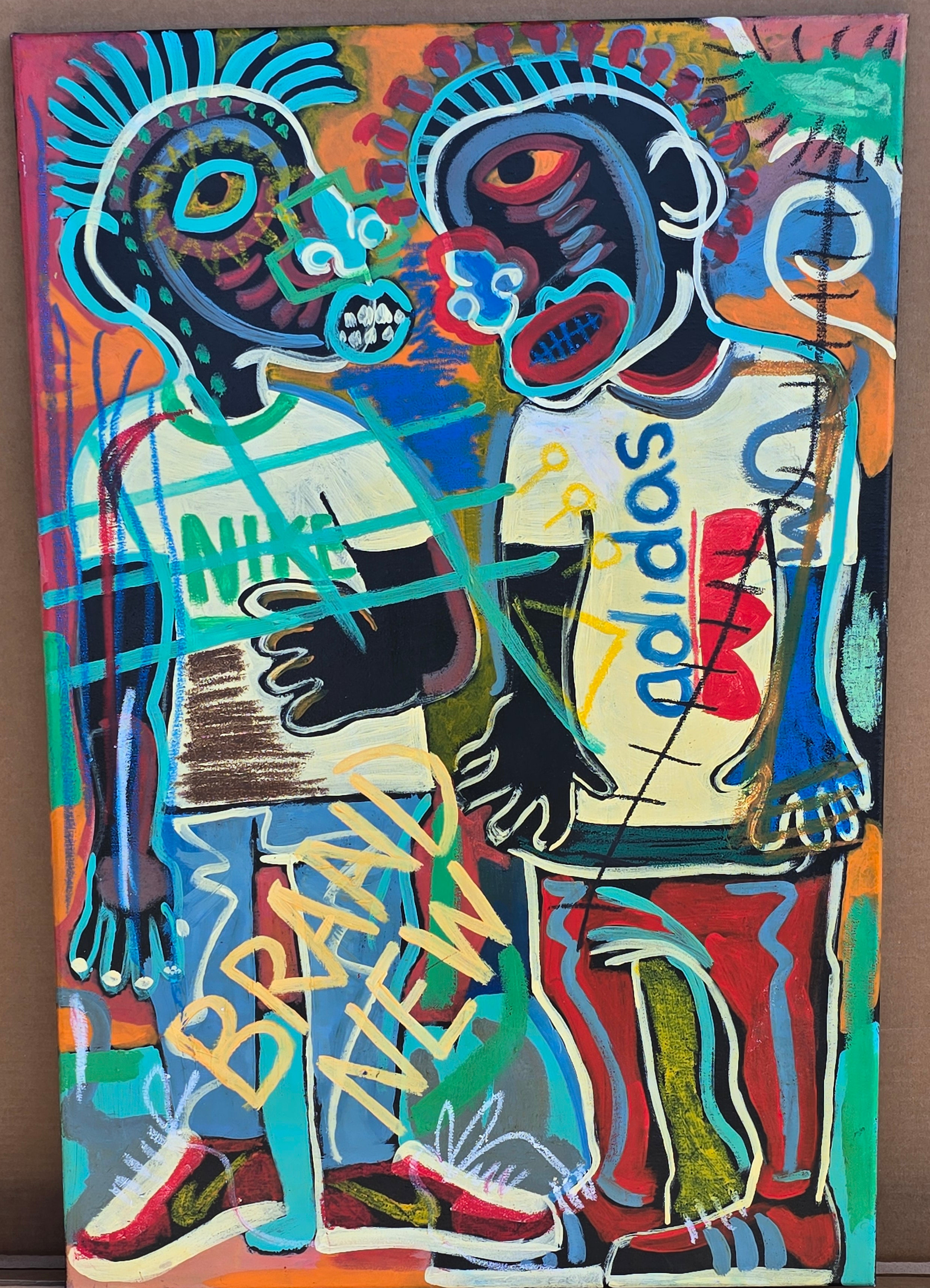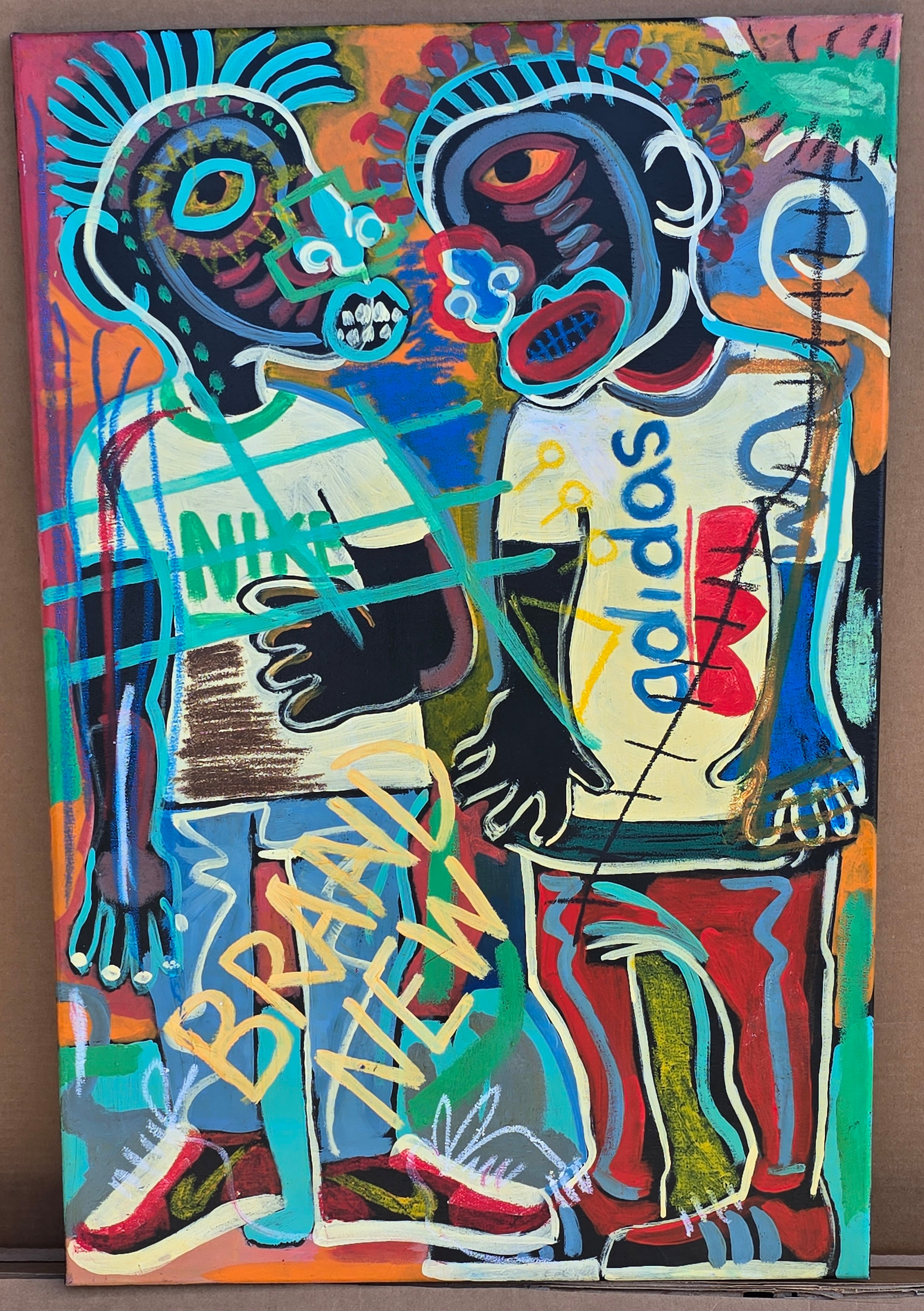 New Skool captures the cultural remix of identity, street rhythm, brand language, and layered self-expression. Graffiti lines, abstract faces, and neon accents collide — echoing hip-hop era graphics, sneaker culture, and youth-coded rebellion.